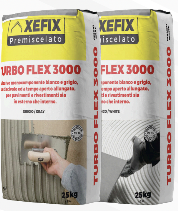 ADESIVO MONOCOMPONENTE BIANCO E GRIGIO, ANTISCIVOLO ED A TEMPO APERTO ALLUNGATO, PER PAVIMENTI E RIVESTIMENTI SIA IN ESTERNO CHE INTERNO